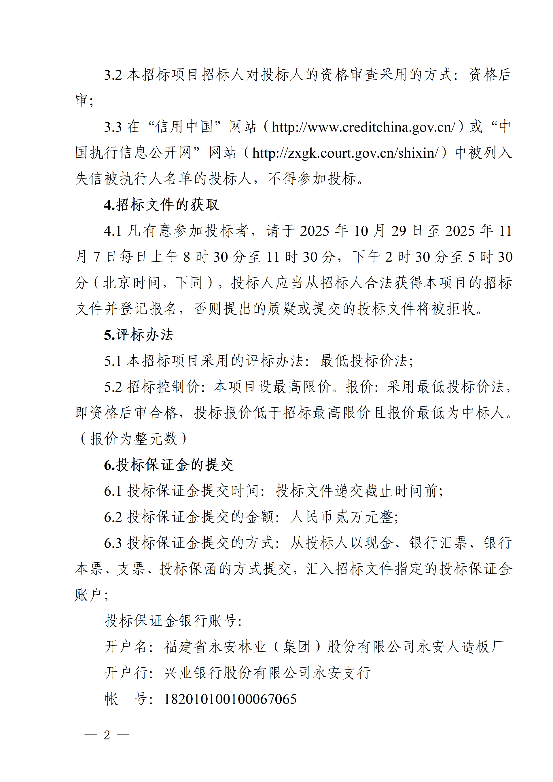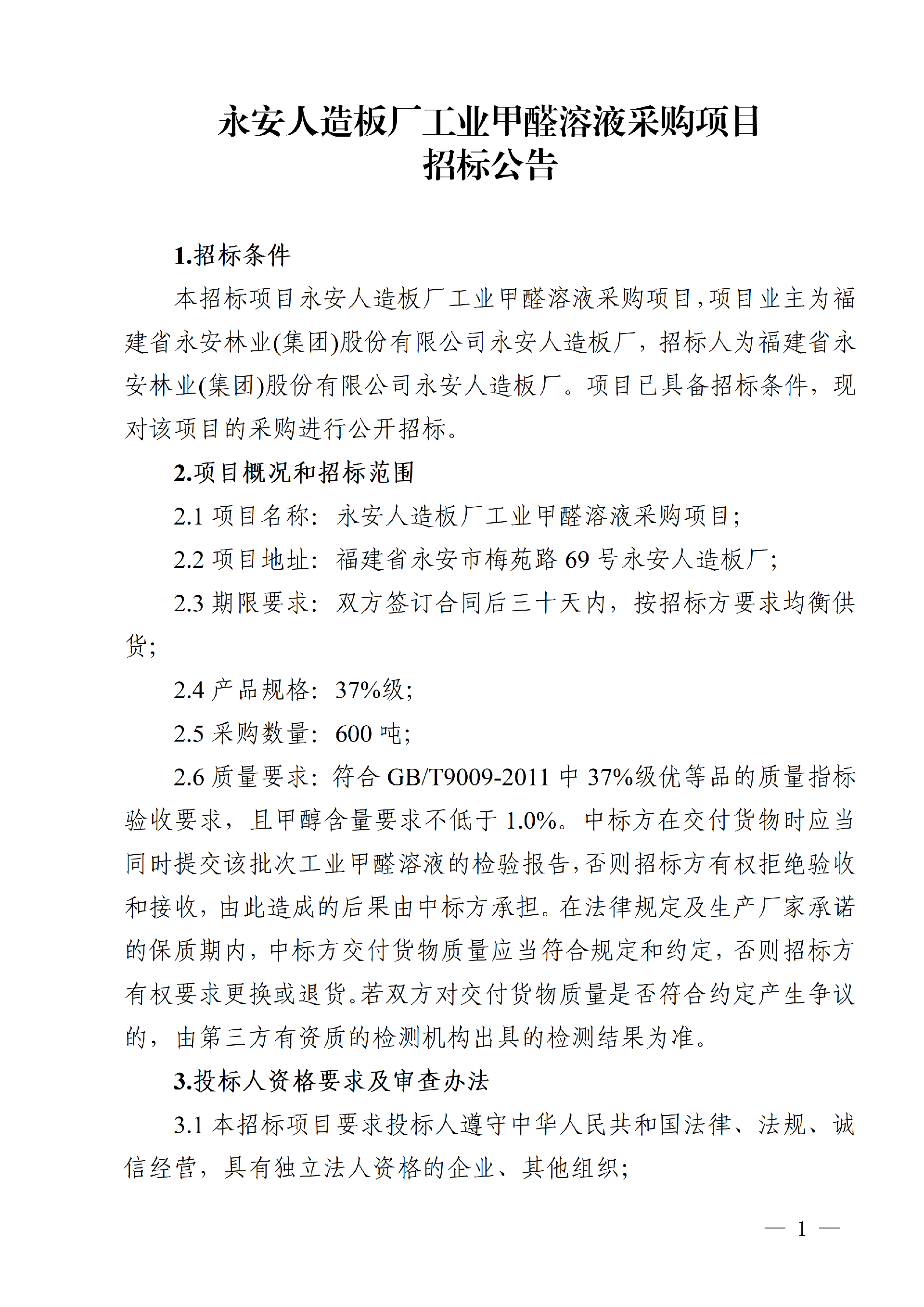 永安人造板厂工业甲醛溶液采购项目招标公告