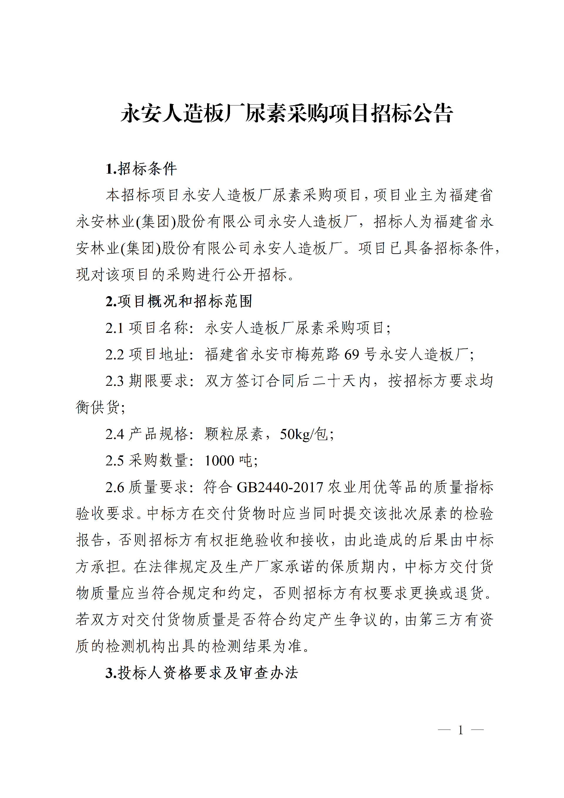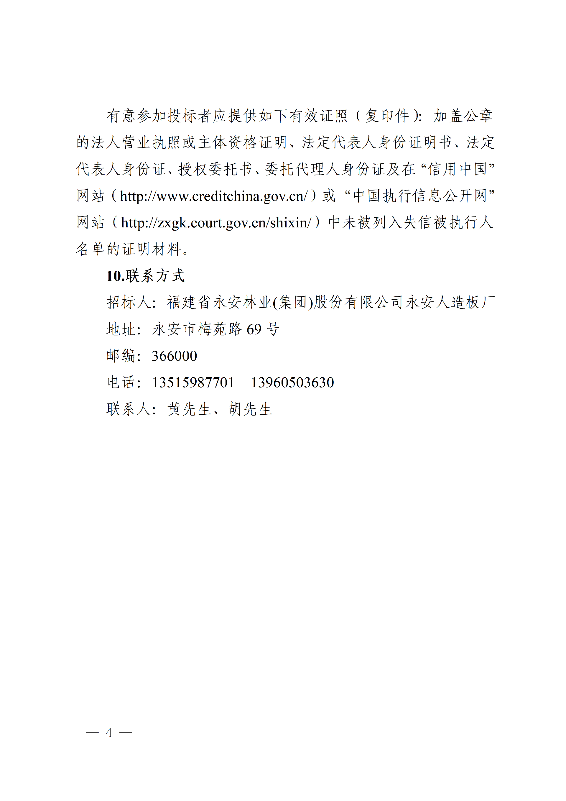 永安人造板厂工业甲醛溶液采购项目招标公告