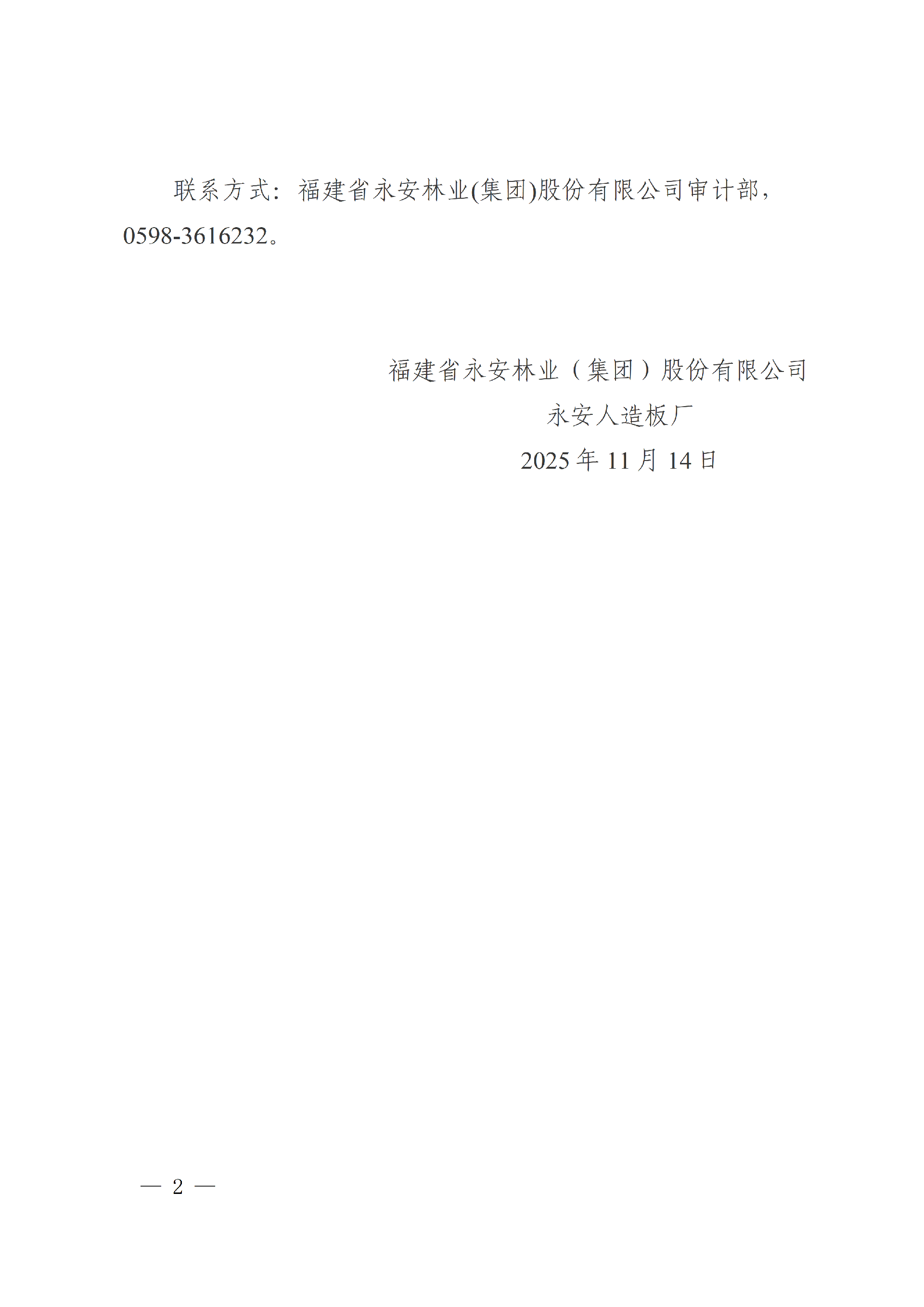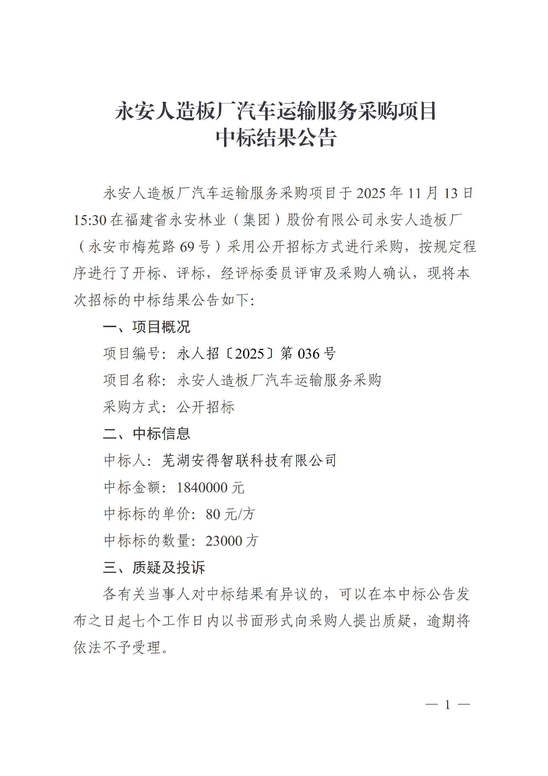 永安人造板厂汽车运输服务采购项目中标结果公告