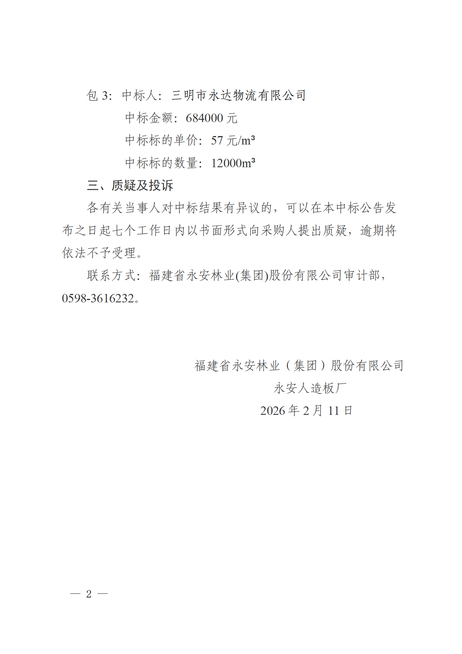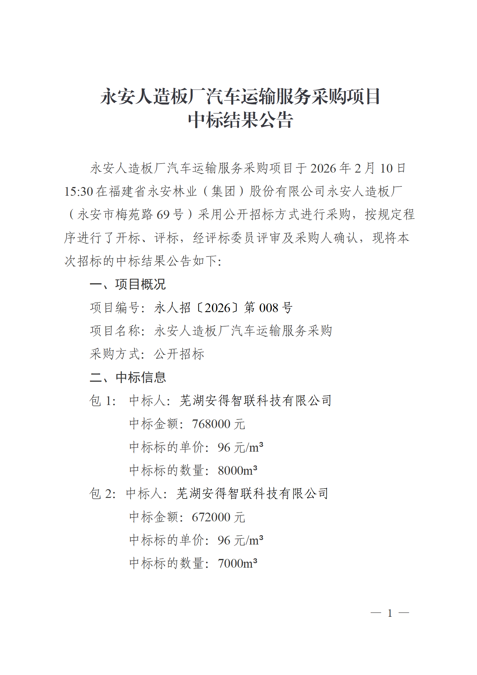 永安人造板厂汽车运输服务采购项目中标结果公告