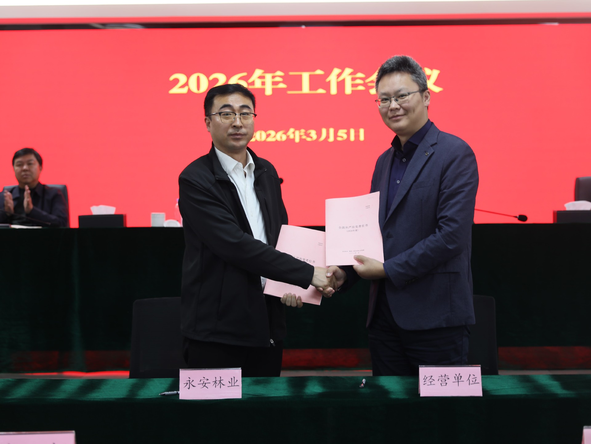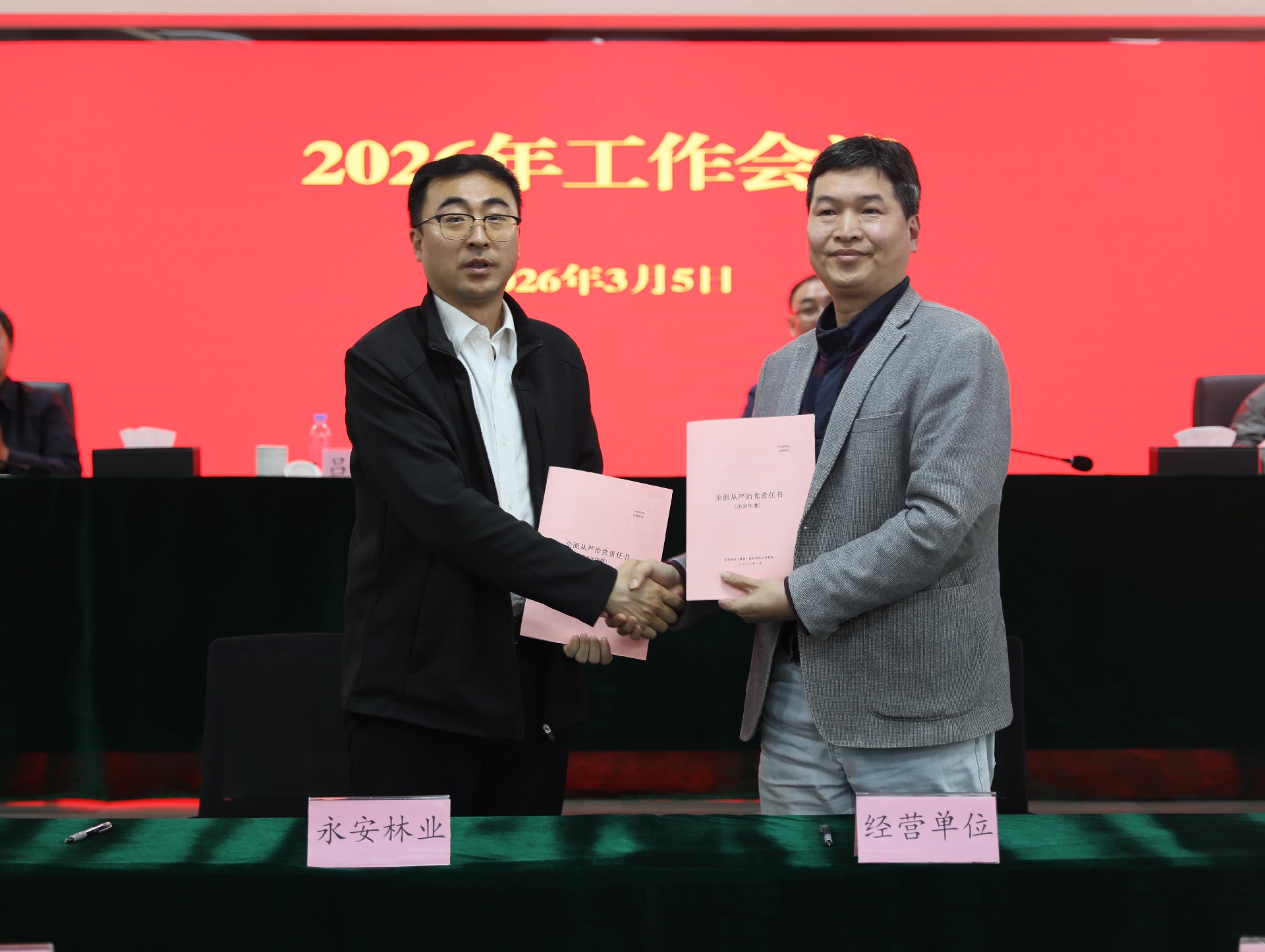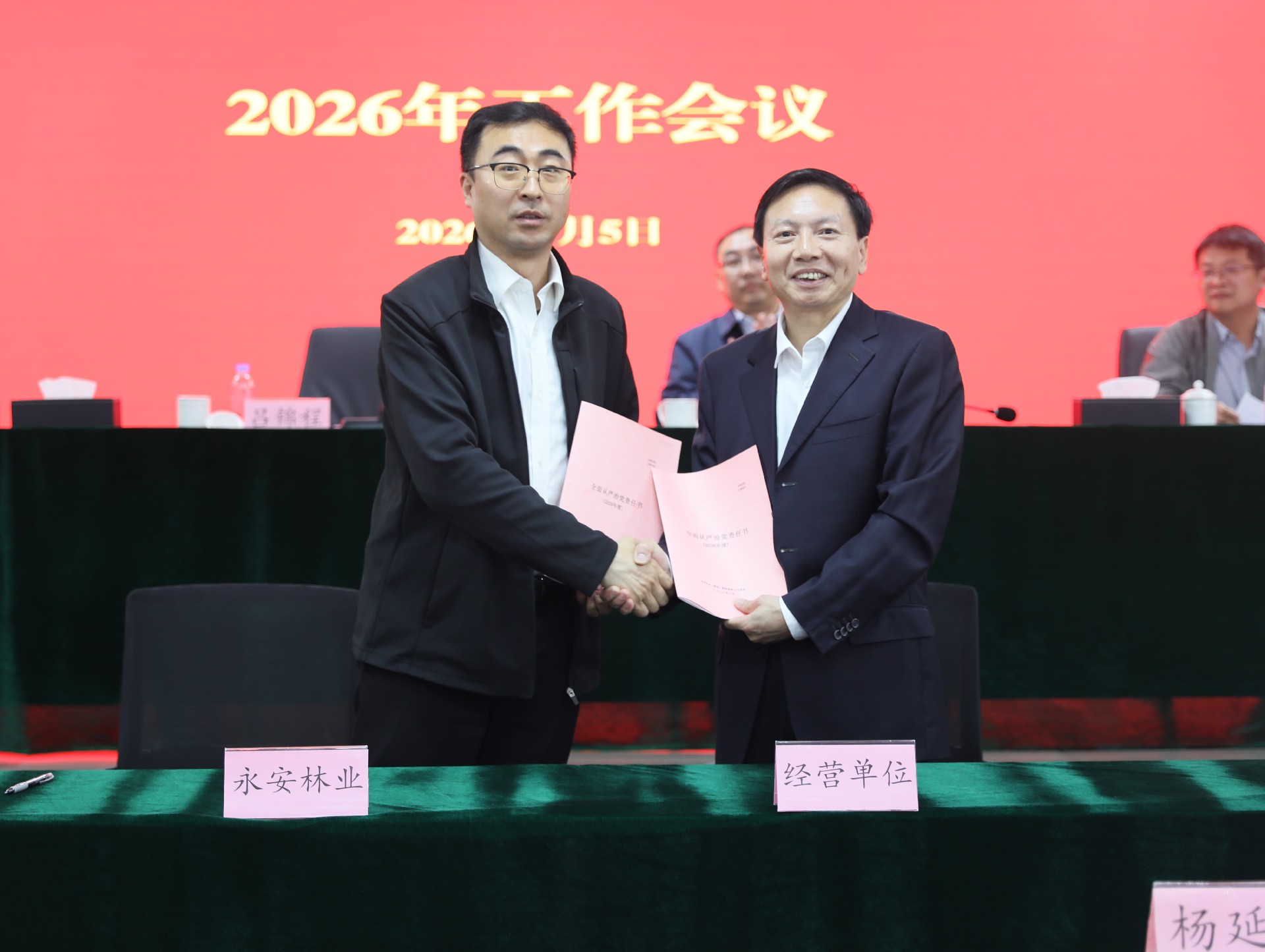 吕锦程和査桂兵分别代表党委和经理层与各基层党支部、各分子公司签订2026年度全面从严治党目标责任书、2026年度经营业绩及安全生产目标责任书。